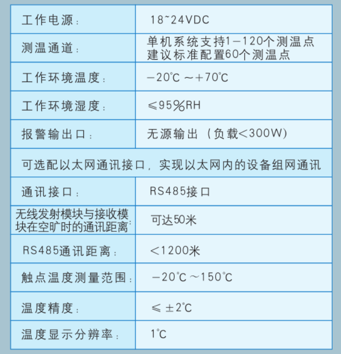 它是集在線溫度測量、數(shù)據(jù)采集、數(shù)據(jù)分析和控制功能于一體的現(xiàn)代化高科技產(chǎn)品。其測溫傳感器電源采用感應(yīng)取電方式供電(≥5A)。該測溫裝置可集中采集、顯示多路電氣接點溫度(默認接收1-120個測溫點,可擴展)數(shù)據(jù)中續(xù)單元可根據(jù)現(xiàn)場情況進行選配。面板防護等級IP54、殼體防護等級IP20。